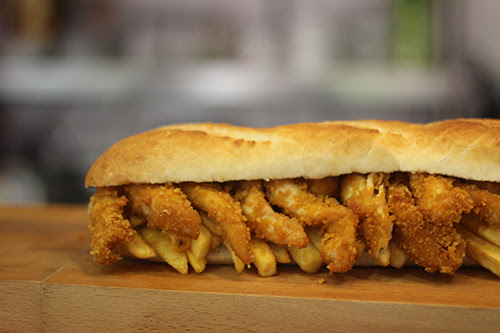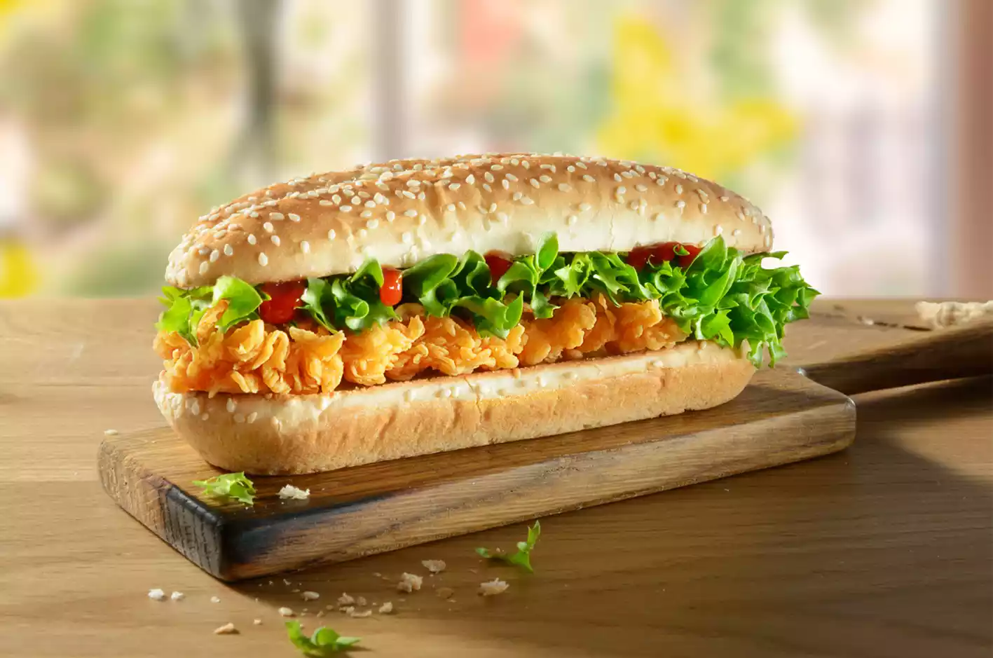 Sandwiç ekmeği arasında kasap çıtır tavuk parçaları, turşu, marul yanında patates kızartması ile servis edilmektedir.