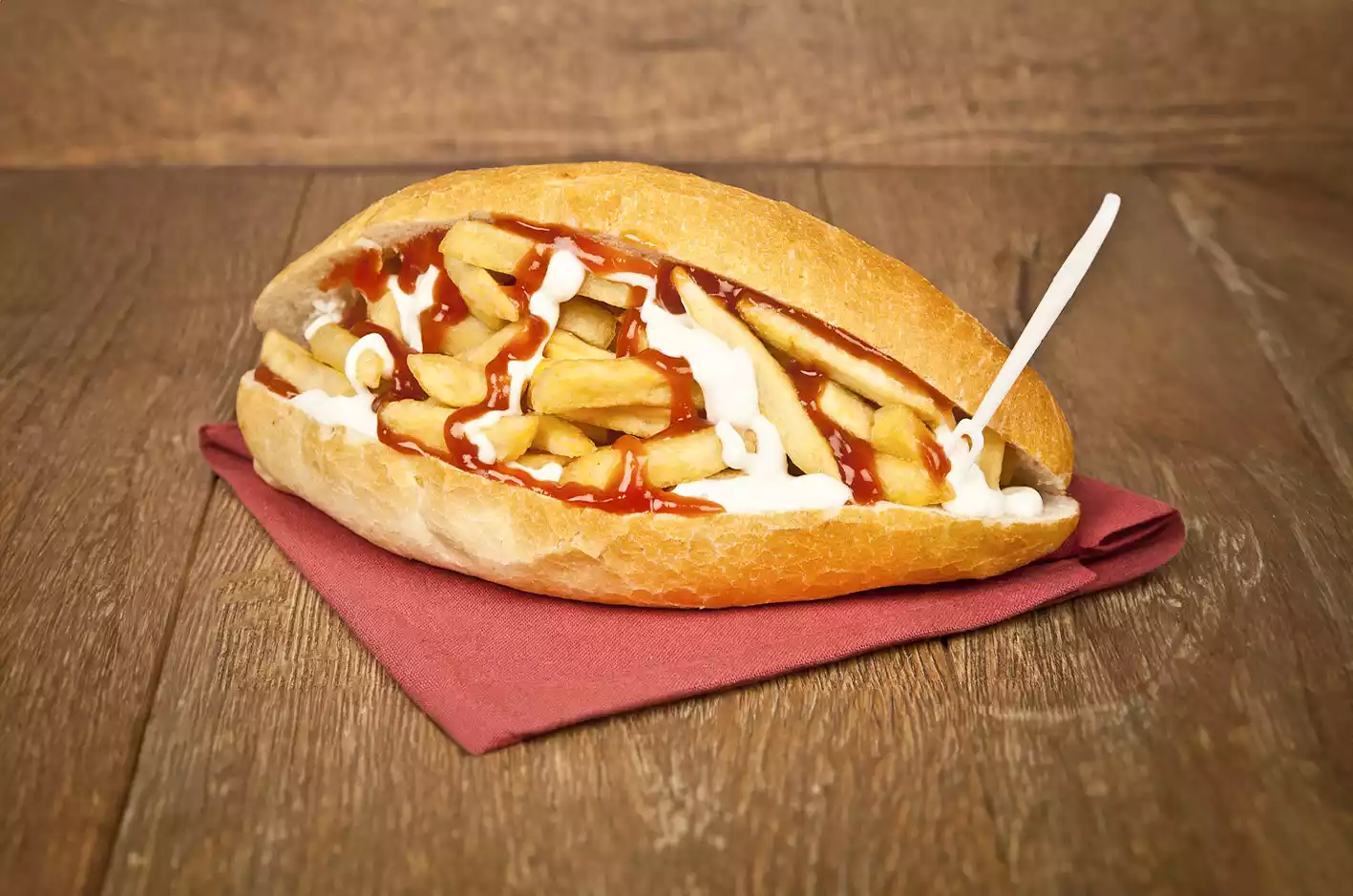 Sandwiç ekmeği arasında patates kızartması ve sosis.