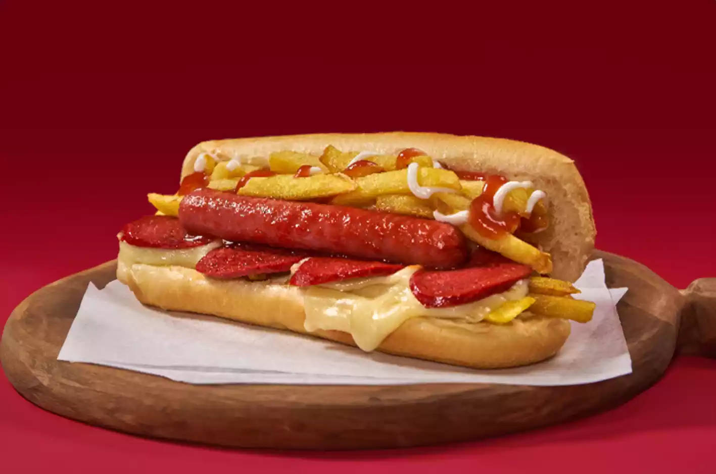 Duble sosis, cheddar peyniri, özel beyaz sos ve acı sos.