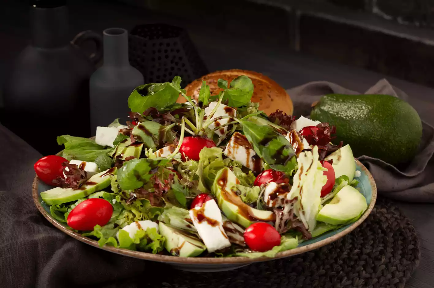 Mevsim yeşilliklerini taptaze şekilde hazırlayıp, domates ekliyoruz ve özel salata sosu ile sosluyoruz.