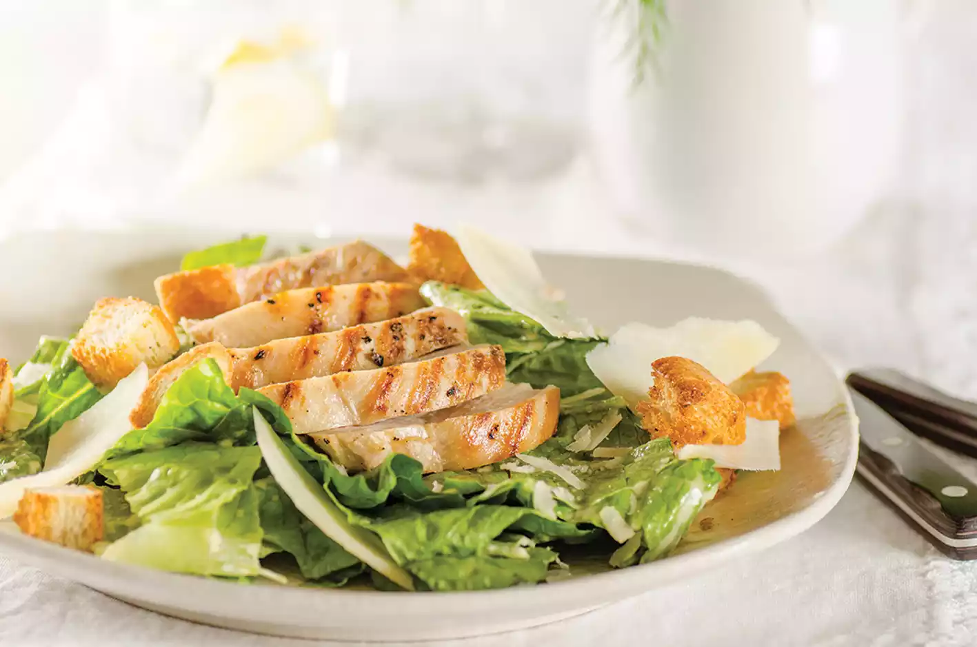Mevsim yeşilliklerini taptaze şekilde hazırlayıp, özel salata sosu ile soslayıp üzerinde ızgara tavuk parçaları ile servis ediyoruz.