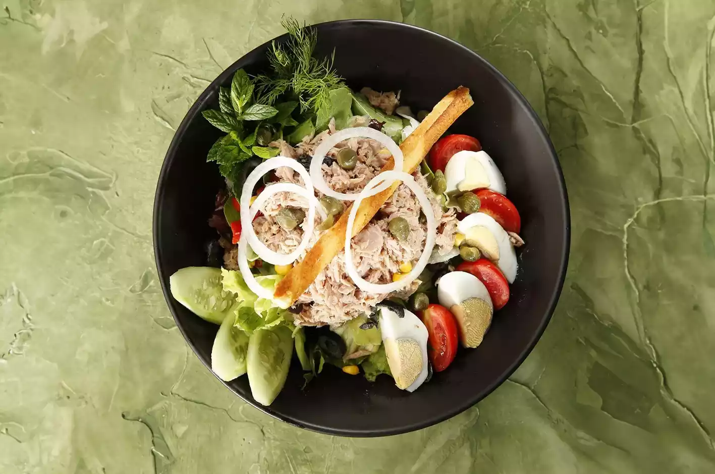 Mevsim yeşilliklerini taptaze şekilde hazırlayıp, özel salata sosu ile soslayıp üzerinde ton balığı ile servis ediyoruz.