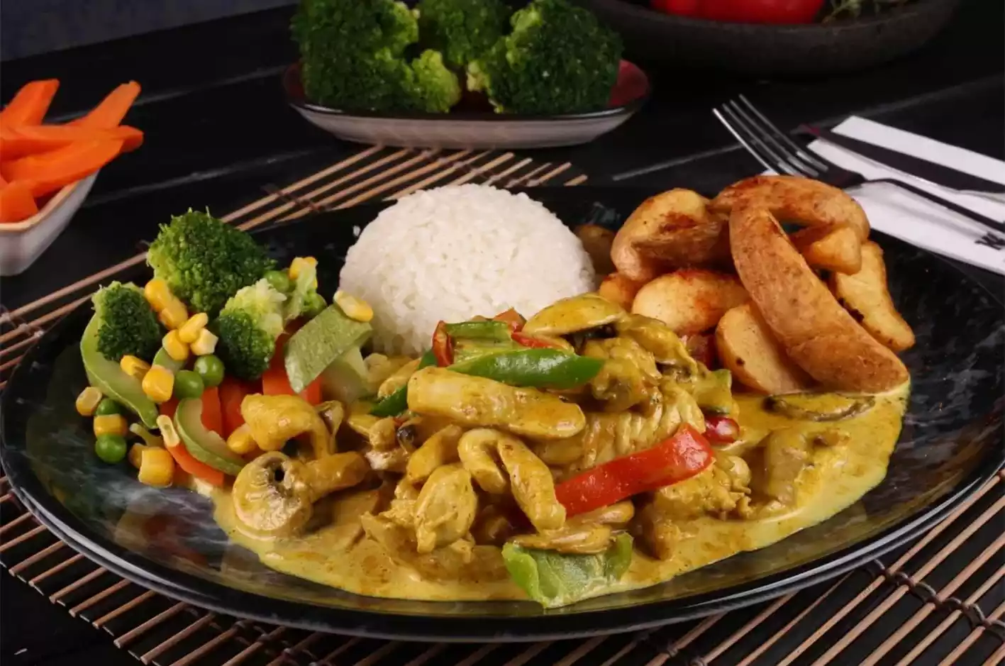 Mevsim salata, kremalı penne makarna, kremalı körili tavuk.