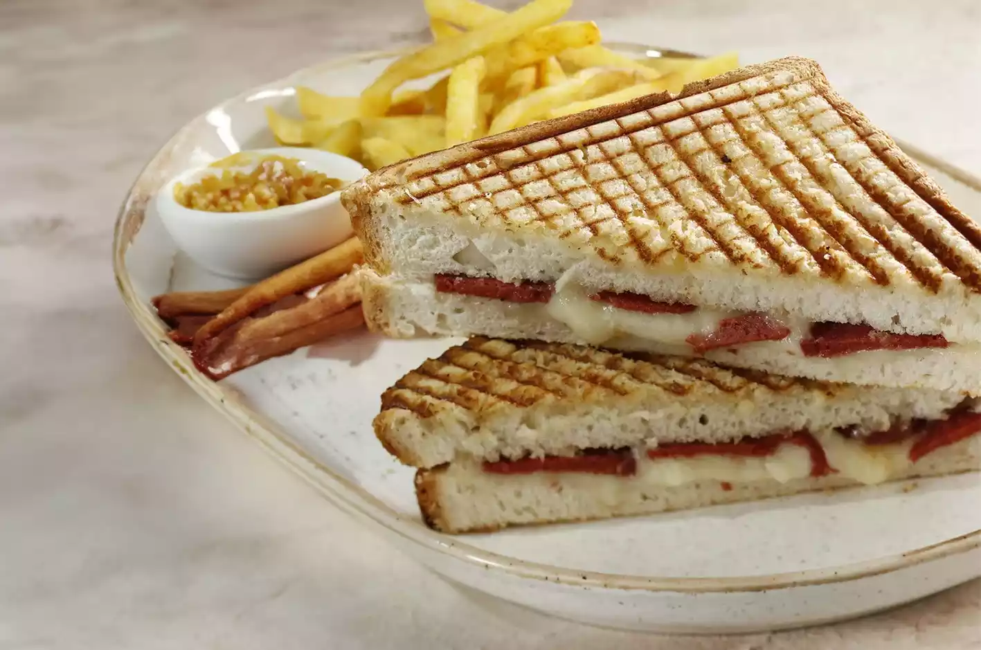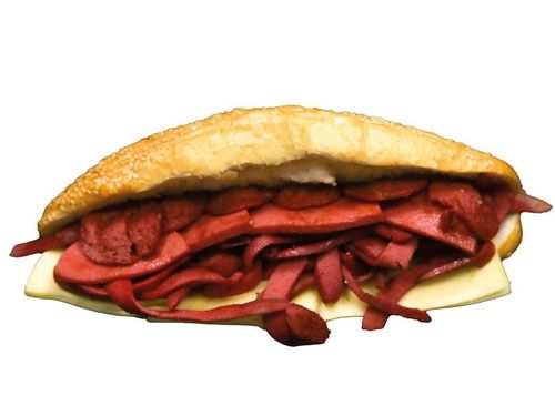 Yarım somun ekmeğinde, gerçek kaşar ,sucuk , - Pataes kızartması ile servis edilir.