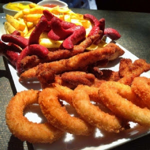 PATATES KIZARTMASI TABANINDA , 4 SOĞAN HALKASI , 4 NUGGET, 2 PARÇA KIZARMIŞ SOSİS , RUS SALATASI , PATATES PÜRESİ
